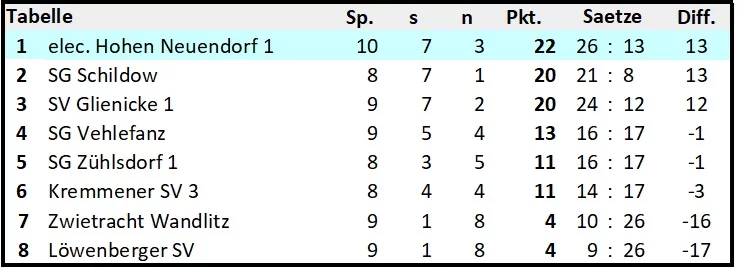 | 39 | SV electr. Hohen Neuendorf 1 | SV Kremmen 3 | Montag | 02.03.2026 | 20:00 | 3:0 | 25:20 25:20 26:24 |