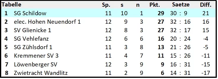 | 46 | SV Kremmen 3 | SV Glienicke 1 | Mittwoch | 15.04.2026 | 19:30 | 1:3 | 28:30 25:23 20:25 22:25 |