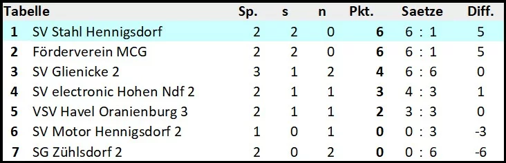 7 | SV Glienicke 2 | SG Zühlsdorf 2 | Montag | 13.10.2025 | 19:30 | 3:0 | 25:19 26:24 25:18 |