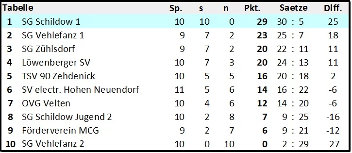 | 52 | OVG Velten | SV electronic Hohen Neuendorf | Freitag | 13.03.26 | 20:15 | 1:3 | 21:25 19:25 25:22 16:25 |