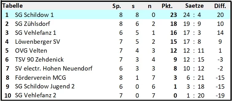 | 39 | SG Zühlsdorf | SG Schildow 1 | Montag | 12.01.26 | 20:15 | 1:3 | 28:26 14:25 16:25 20:25 |